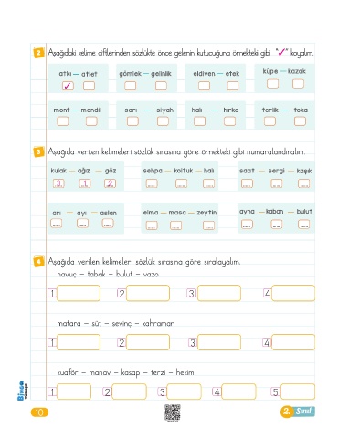 2 Aşağıdaki kelime çiftlerinden sözlükte önce gelenin kutucuğuna örnekteki gibi “3” koyalım.