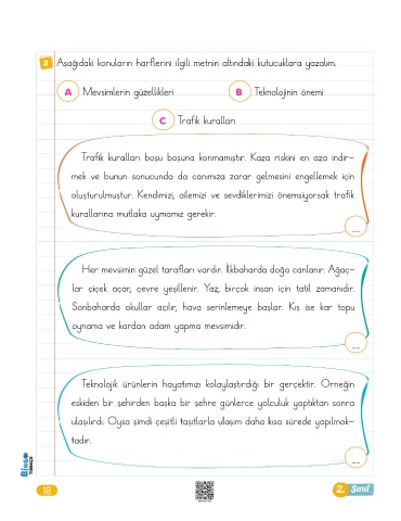 2 Aşağıdaki konuların harflerini ilgili metnin altındaki kutucuklara yazalım.