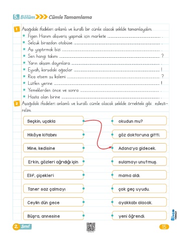 1 Aşağıdaki ifadeleri anlamlı ve kurallı bir cümle olacak şekilde tamamlayalım.