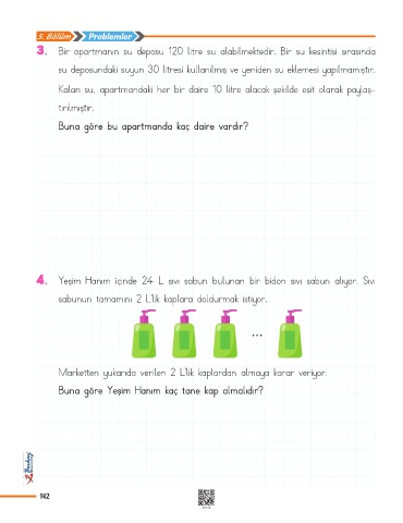 4. Yeşim Hanım içinde 24 L sıvı sabun bulunan bir bidon sıvı sabun alıyor. Sıvı