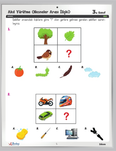 Akıl Yürütme (Nesneler Arası İlişki) 3. Sınıf Şekiller arasındaki ilişkilere göre “?” olan yerlere gelmesi gereken şekilleri işaret- leyiniz. 1. A. B. C. D. 2. A. B. C. D. 5 Bilsem