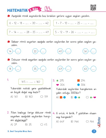 2. 9’dan başlayıp ileriye dokuzar ritmik 4. 6 onluk, 4 birlik, 7 yüzlükten oluşan