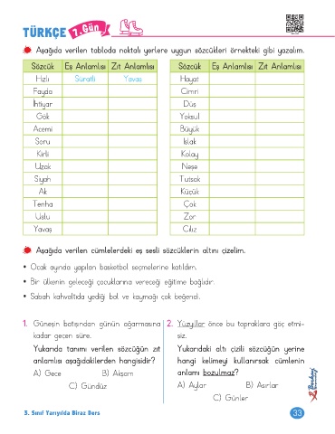 Aşağıda verilen tabloda noktalı yerlere uygun sözcükleri örnekteki gibi yazalım.