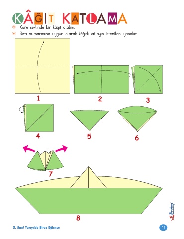 L K Â Ğ I T K A T A A M Kare şeklinde bir kâğıt alalım. Sıra numarasına uygun olarak kâğıdı katlayıp istenileni yapalım. 1 2 3 4 5 6 7 8 3. Sınıf Yarıyılda Biraz Eğlence 11
