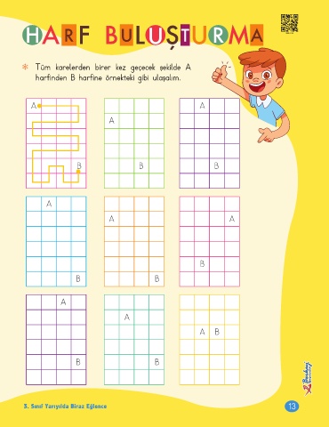 HA R F B U L Ş U M A 3BE-013 U R T Tüm karelerden birer kez geçecek şekilde A harfinden B harfine örnekteki gibi ulaşalım. A A A B B B A A A B B B A A A B B B 3. Sınıf Yarıyılda Biraz Eğlence 13