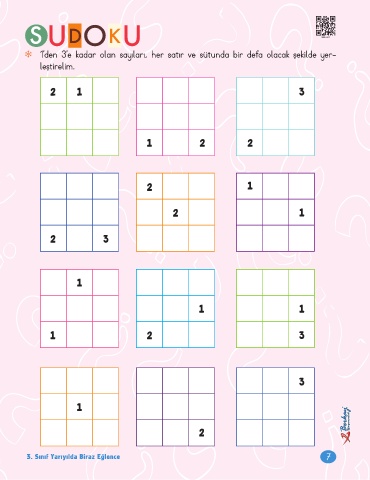 S U D O U 3BE-007 K 1’den 3’e kadar olan sayıları, her satır ve sütunda bir defa olacak şekilde yer- leştirelim. 2 1 3 1 2 2 2 1 2 1 2 3 1 1 1 1 2 3 3 1 2 3. Sınıf Yarıyılda Biraz Eğlence 7