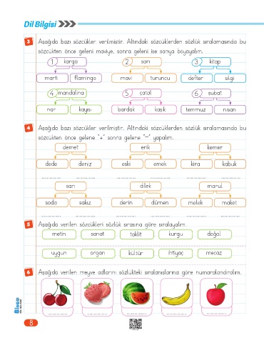 6 Aşağıda verilen meyve adlarını sözlükteki sıralanışlarına göre numaralandıralım.