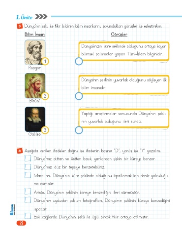 3 Dünya’nın şekli ile fikir bildiren bilim insanlarını, savundukları görüşler ile eşleştirelim.