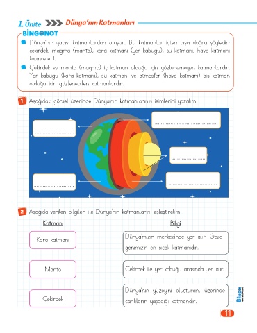 2 Aşağıda verilen bilgileri ile Dünya’nın katmanlarını eşleştirelim.