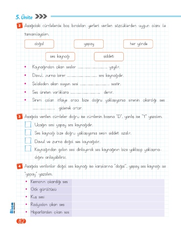 4 Aşağıda verilenler doğal ses kaynağı ise karşılarına "doğal”, yapay ses kaynağı ise