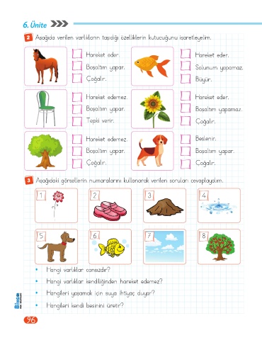2 Aşağıda verilen varlıkların taşıdığı özelliklerin kutucuğunu işaretleyelim.