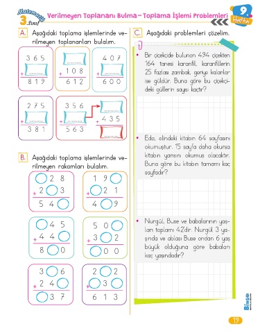 A. Aşağıdaki toplama işlemlerinde ve- C. Aşağıdaki problemleri çözelim.