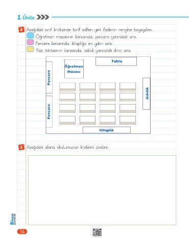 2 Aşağıdaki sınıf krokisinde tarif edilen yeri ifadenin rengine boyayalım.