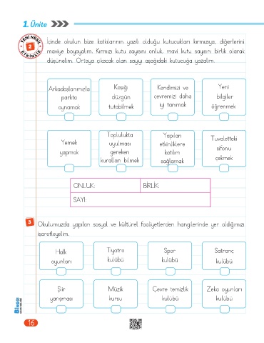 maviye boyayalım. Kırmızı kutu sayısını onluk, mavi kutu sayısını birlik olarak