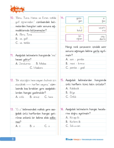 13. “G...ç” kelimesindeki noktalı yere aşa- 16. Aşağıdaki kelimelerin hangisi hecele-