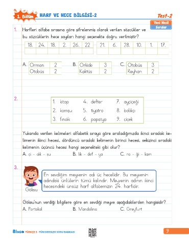 1. Bölüm HARF - HECE - SÖZÜCÜKGİSİ-2 Test-1