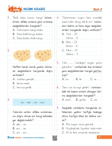 1. “Balık, baba, bostan, banyo” kelime- 4. “Öğretmenim bugün beni sınavdaki