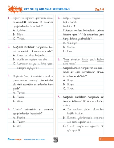 1. Bölüm ZIT VE EŞ ANLAMLI KELİMELER-1 Test-4