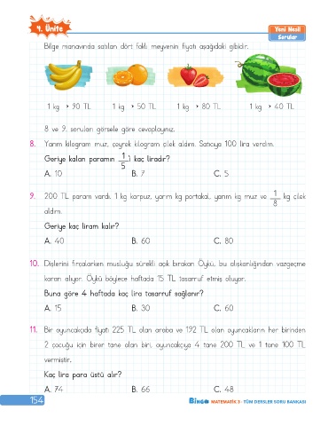 8. Yarım kilogram muz, çeyrek kilogram çilek aldım. Satıcıya 100 lira verdim.
