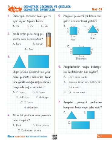 1. Dikdörtgen prizmanın köşe, yüz ve 5. Aşağıdaki geometrik şekillerden han-