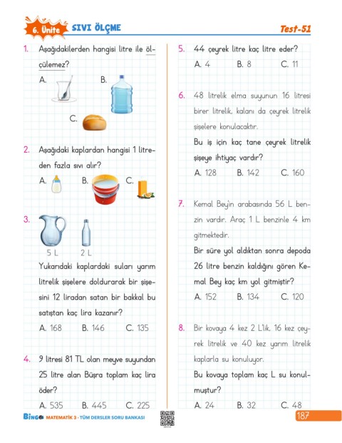 A. 168 B. 146 C. 135 8. Bir kovaya 4 kez 2 L’lik, 16 kez çey-