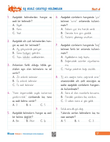 1. Bölüm EŞ SESLİ (SESTEŞ) KELİMELER Test-6