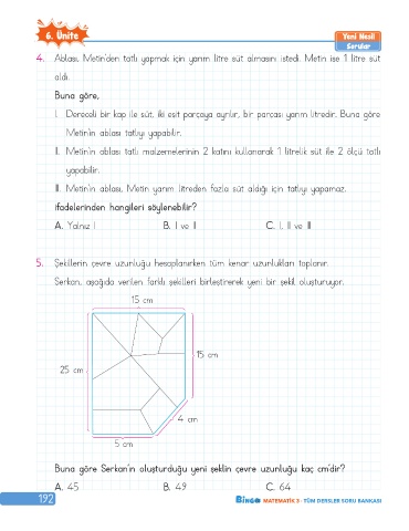 III. Metin’in ablas›, Metin yarım litreden fazla süt aldığı için tatl›y› yapamaz.