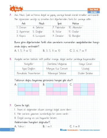 7. Aslı, Nazlı, İpek ve Hatice doğal ve yapay çevreye karışık olarak örnekler vermişlerdir.