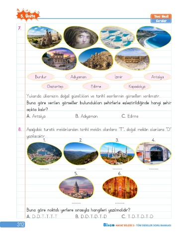 8. Aşağıdaki turistik mekânlardan tarihî mekân olanlara "T”, doğal mekân olanlara "D”