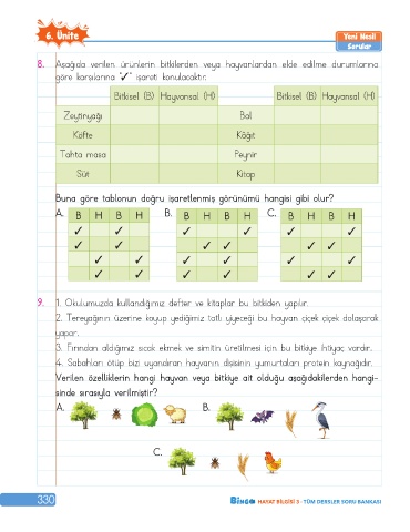 8. Aşağıda verilen ürünlerin bitkilerden veya hayvanlardan elde edilme durumlarına