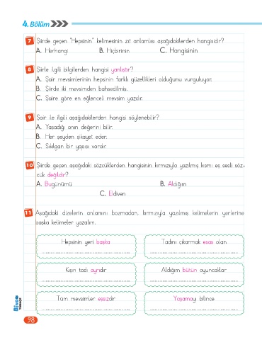 7 Şiirde geçen “Hepsinin” kelimesinin zıt anlamlısı aşağıdakilerden hangisidir?