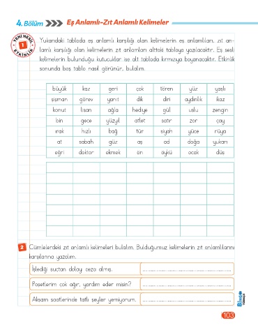 lamlı karşılığı olan kelimelerin zıt anlamları alttaki tabloya yazılacaktır. Eş sesli