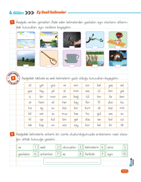 2 Aşağıdaki tabloda eş sesli kelimelerin yazılı olduğu kutucukları boyayalım.
