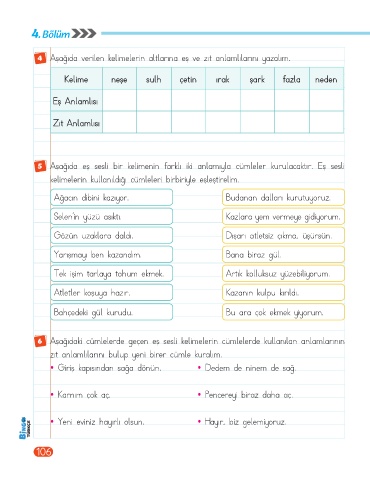 4 Aşağıda verilen kelimelerin altlarına eş ve zıt anlamlılarını yazalım.