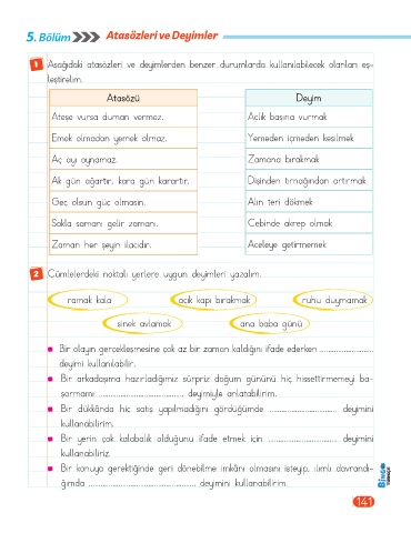 2  Cümlelerdeki noktalı yerlere uygun deyimleri yazalım.