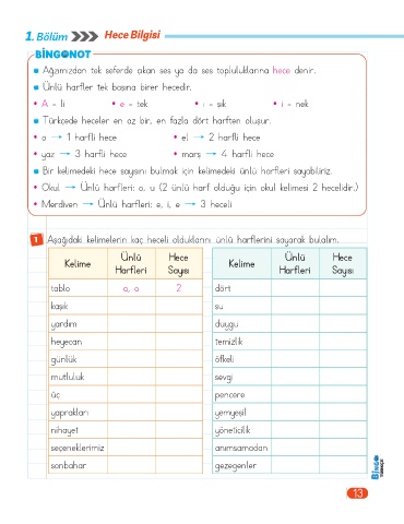 1 Aşağıdaki kelimelerin kaç heceli olduklarını ünlü harflerini sayarak bulalım.