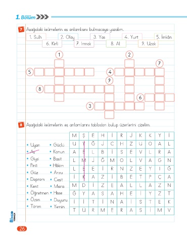 7 Aşağıdaki kelimelerin eş anlamlısını bulmacaya yazalım.