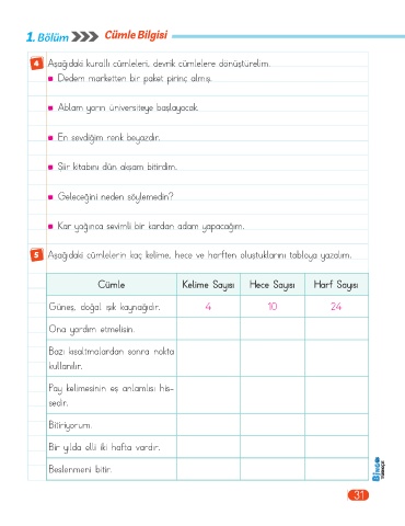 5 Aşağıdaki cümlelerin kaç kelime, hece ve harften oluştuklarını tabloya yazalım.