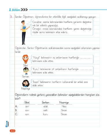 Öğrencilerin noktalı yerlere yazacakları kelimeler aşağıdakilerden hangileri ola-