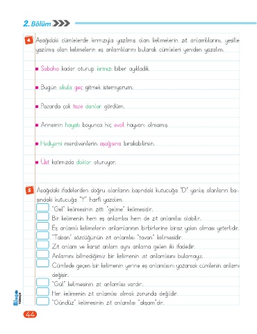 4 Aşağıdaki cümlelerde kırmızıyla yazılmış olan kelimelerin zıt anlamlılarını, yeşille