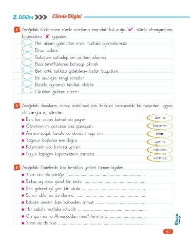 1 Aşağıdaki ifadelerden cümle olanların başındaki kutucuğa “✔”, cümle olmayanların