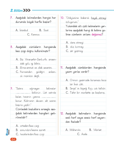 7. Aşağıdaki kelimelerden hangisi her 10. “Gökyüzüne bakarak hayal etmeyi