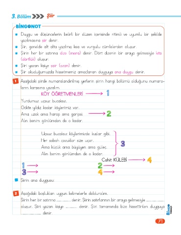 1 Aşağıdaki şiirde numaralandırılmış yerlerin şiirin hangi bölümü olduğunu numara-