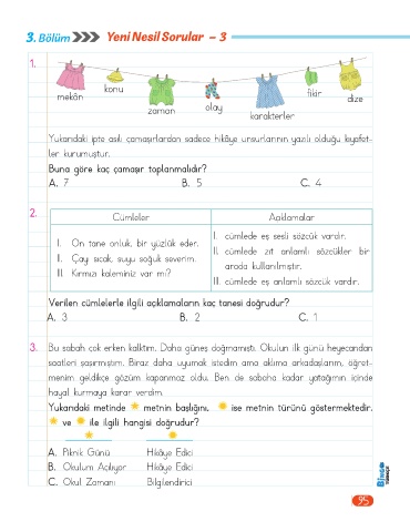 Yukarıdaki ipte asılı çamaşırlardan sadece hikâye unsurlarının yazılı olduğu kıyafet-
