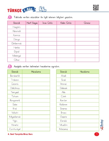 1 Tabloda verilen sözcükler ile ilgili istenen bilgileri yazalım.
