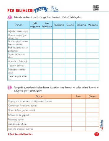 1 Tabloda verilen durumlarda görülen hareketin türünü belirleyelim.
