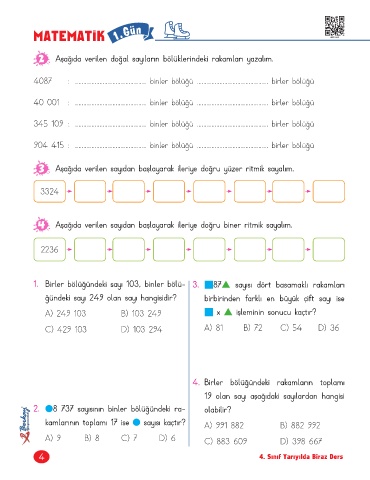 1. Birler bölüğündeki sayı 103, binler bölü- 3. 87 sayısı dört basamaklı rakamları