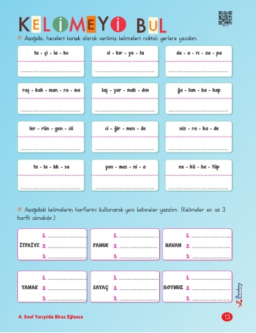Aşağıdaki kelimelerin harflerini kullanarak yeni kelimeler yazalım. (Kelimeler en az 3