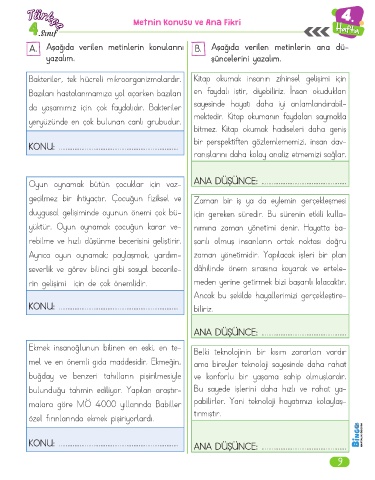 A. Aşağıda verilen metinlerin konularını B. Aşağıda verilen metinlerin ana dü-