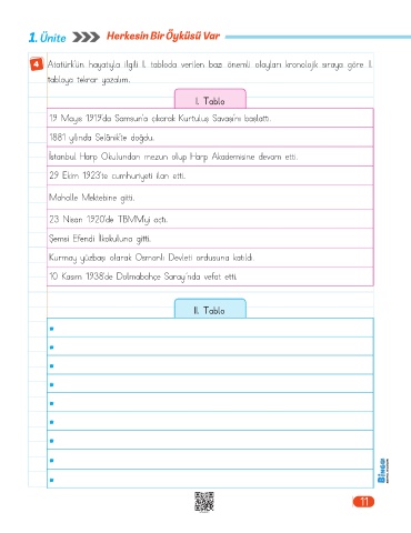 4 Atatürk’ün hayatıyla ilgili I. tabloda verilen bazı önemli olayları kronolojik sıraya göre II.